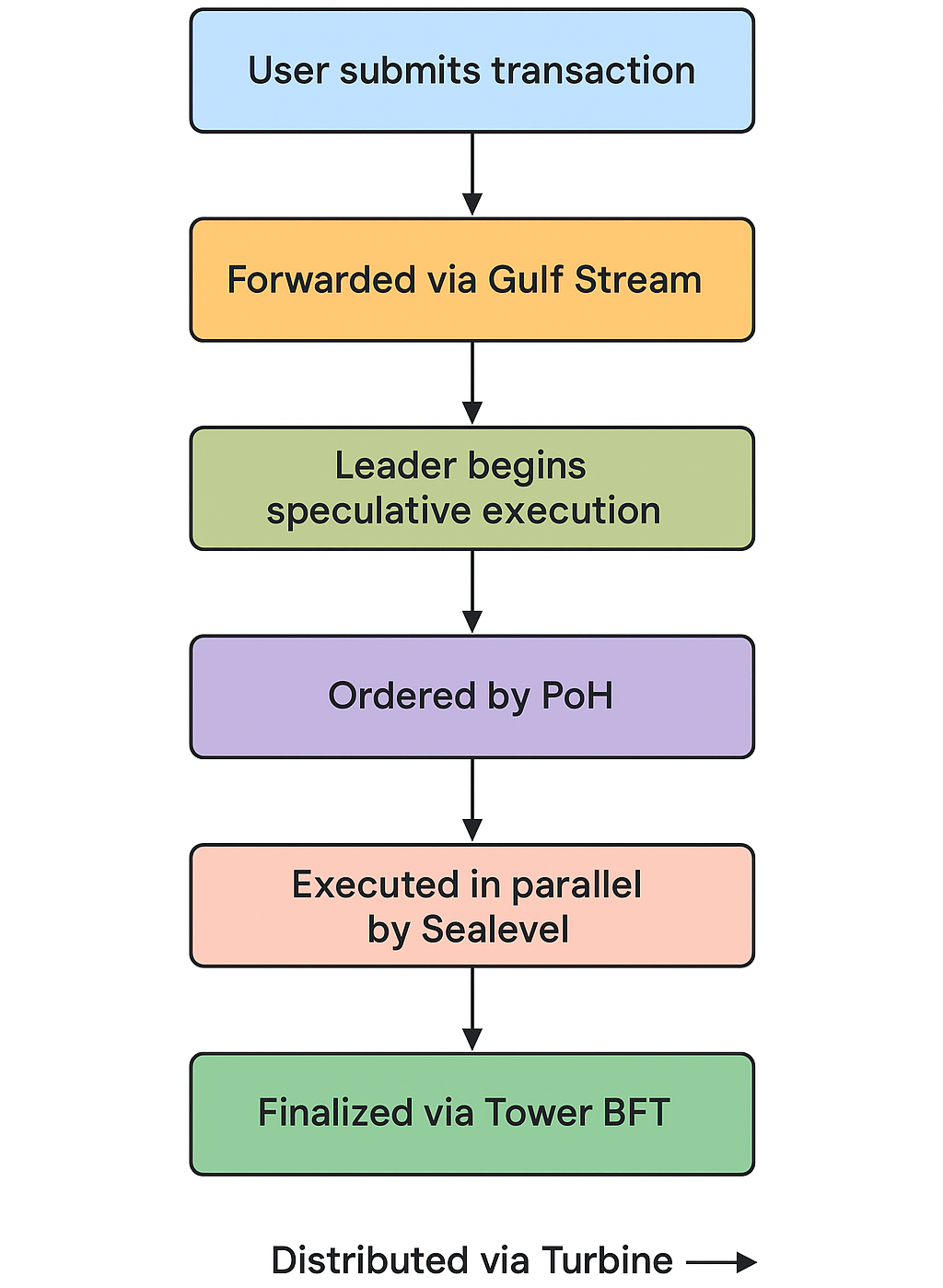 Working in concert with PoH and a predictable leader schedule, Gulf Stream ensures fast, direct transaction routing, accelerating Solana’s transaction pipeline compared to traditional systems.