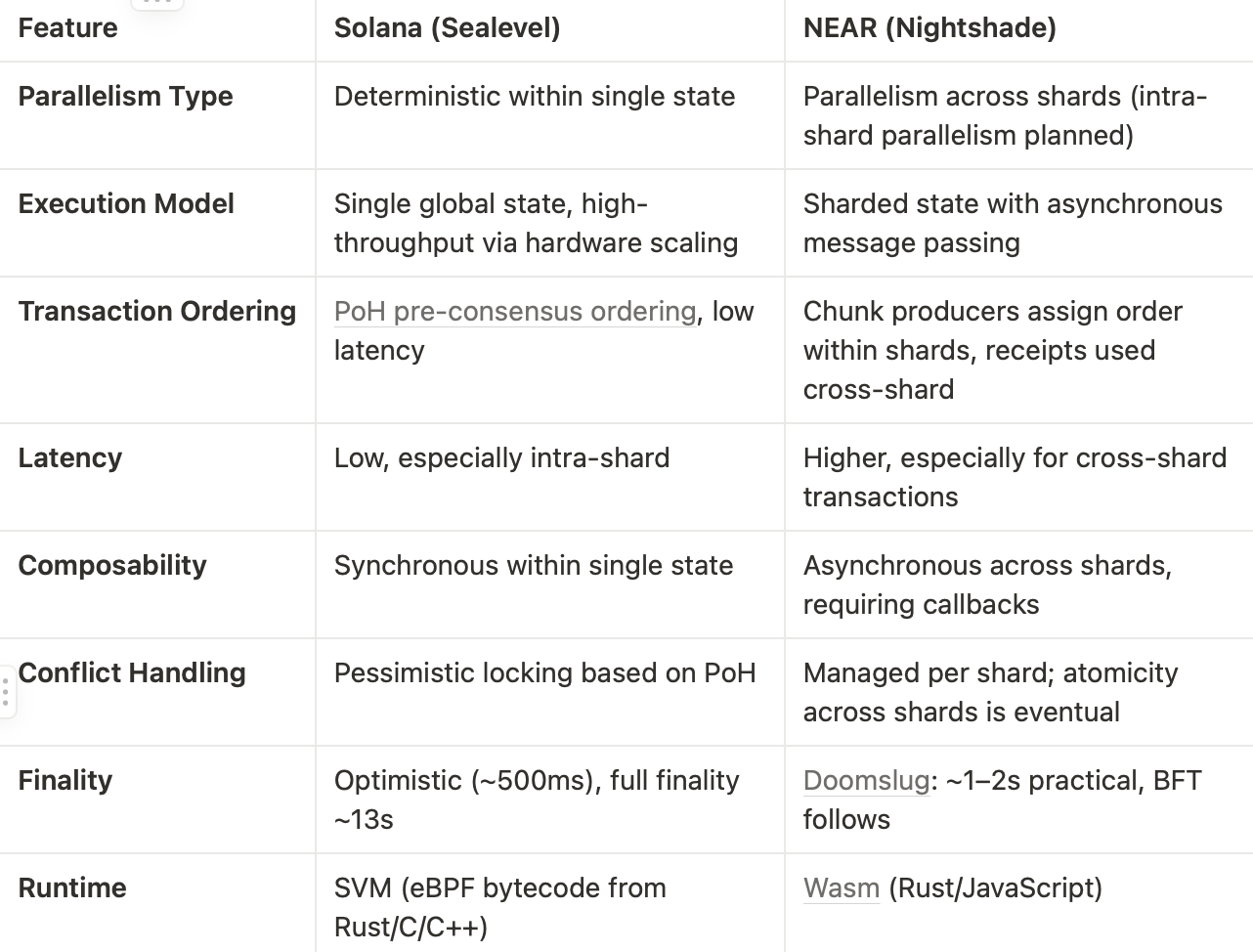 In summary, NEAR excels at distributing workload across the network (inter-shard parallelism) but lags Solana in concurrent processing within a single shard — a gap NEAR intends to close.